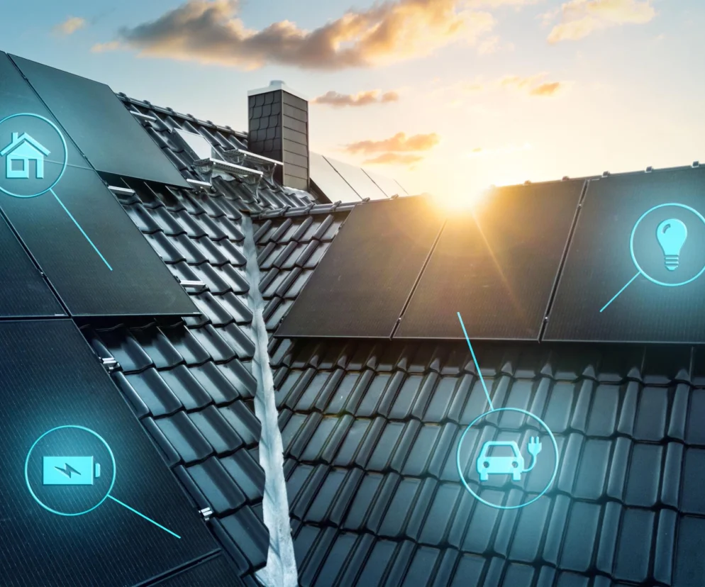- Dachy z panelami fotowoltaicznymi sterowanymi automatycznie: w inteligentnych domach panele fotowoltaiczne na dachach często są wyposażone w systemy śledzące słońce (solar tracking), a także połączone z inteligentnymi falownikami i systemami zarządzania energią, które automatycznie optymalizują zużycie prądu i magazynowana w akumulatorach.