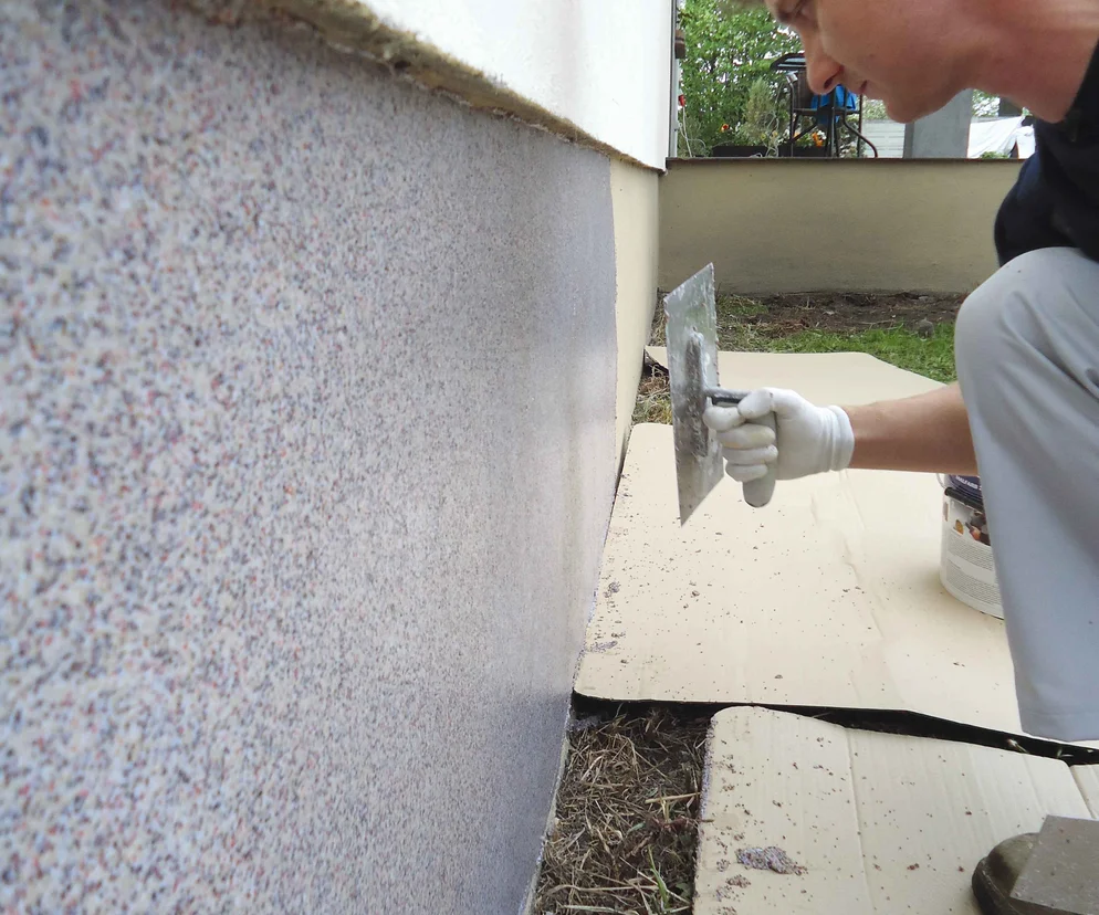 Gdy masz zamiar tynkować cokół nowego budynku, wcześniej wystarczy tylko zagruntować podłoże. Dom odnawiany wymaga więcej zachodu. Zaczyna się od sprawdzenia, czy podłoże jest suche, przy czym nie chodzi tylko o plamy wody pozostałe po niedawnym deszczu. Jeśli cokół w suchy dzień jest wilgotny, to znak, że ściana fundamentowa podciąga kapilarnie wodę z gruntu, co świadczy o braku lub uszkodzeniu hydroizolacji. Wtedy z tynkowaniem trzeba się wstrzymać. Będzie można o nim pomyśleć dopiero wtedy, gdy hydroizolacja zostanie naprawiona albo odtworzona, a ściana należycie wysuszona. Wynikiem zawilgocenia cokołu jest odspajanie się i odpadanie starego tynku. Gdy zaobserwujesz takie zjawisko, naprawę trzeba zacząć od skucia go. Przedtem musisz usunąć wszelkie przeszkody utrudniające dostęp do cokołu oraz zabezpieczyć grubą folią opaskę ze żwiru lub płyt betonowych biegnącą wokół ścian. Jeżeli tynk na cokole trzyma się dobrze, wystarczy oczyścić go z plam, odkurzyć powierzchnię i zagruntować. Podłoże pod tynk mozaikowy musi być równe, gdyż po nałożeniu jego warstwa ma grubość do 3 mm, więc odbiją się na nim wszelkie krzywizny.