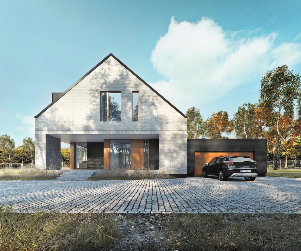 Garaż w bryle budynku stanowi integralną część domu – dzieli z nim fundamenty, ściany nośne i często dach. Dzięki temu całość prezentuje się spójnie i nowocześnie, a komunikacja między garażem a wnętrzem domu odbywa się bez wychodzenia na zewnątrz. Jest to rozwiązanie szczególnie wygodne dla rodzin z dziećmi lub osób ceniących codzienną praktyczność.