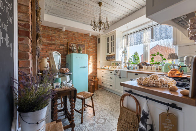 Klimat kuchni budują nie tylko ceglane ściany, ale także sufit wykończony deskami postarzanymi techniką shabby chic (Allegro.pl). Podłoga wygląda na równie starą, ale oczywiście to nowe płytki kupione w PHU Projekt Salon Łazienek w Gdańsku. Oryginalny, postarzany „patchwork” Renata wypatrzyła przypadkiem. To turecki matowy gres Nikea Sephia (20x20 cm) marki Yurtbay. Jego ułożenie okazało się trudne i czasochłonne, bo producent nie dołączył instrukcji tworzenia wzorów tak, by na metrze kwadratowym nie powtarzał się motyw. W efekcie fachowcy i pani domu spędzili długie godziny nad ułożeniem idealnej mozaiki. Stonowanemu wnętrzu koloru dodają miętowe AGD (Smeg).