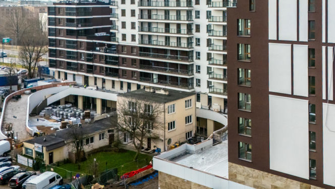 Dom otoczony blokiem przy ul. Bacha 35 w Warszawie