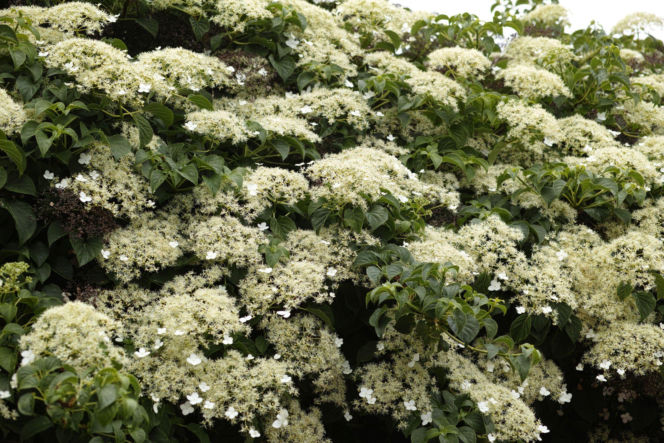 Zebrane w duże, płaskie baldachy kwiaty hortensji pnącej, atrakcyjnie wyglądają się na tle intensywnej zieleni liści