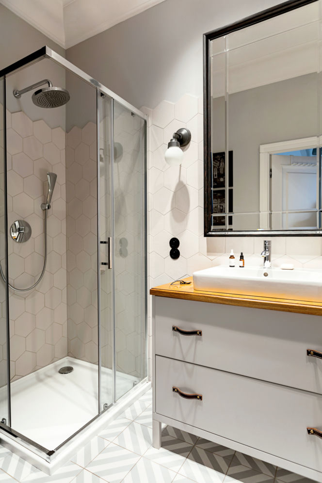 W JODEŁKĘ Łazienka nie jest duża, ale dzięki temu, że pralkę przeniesiono do pomieszczenia gospodarczego, udało się tu zmieścić i prysznic, i wannę, na których zależało właścicielom. – Drobne płytki ścienne, ułożone w jodełkę, nawiązują do wzoru parkietu w pozostałej części mieszkania – wyjaśniają projektantki. – Ciekawym rozwiązaniem w łazienkach o małej powierzchni jest kabina prysznicowa bez brodzika, ze skrzydłami całkowicie składanymi na ściany – dodają. GDZIE KUPIĆ: płytki Equipe Chevron (Wall White Matt, Wall Sky Blue) – alekafelki.pl; umywalka nablatowa 60 Invena Teja – Leroy Merlin; szafka – na zamówienie; lustro Langesund – IKEA