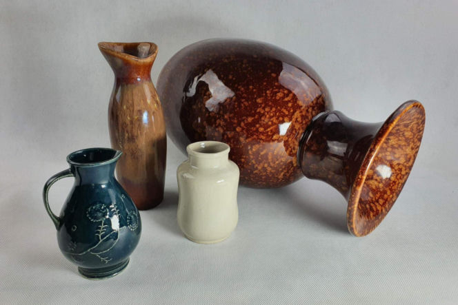 Wazon duży i dzbanuszek oraz pojemnik kuchenny (bez korka) projektu Bronisława Wolanina, wazon z nieregularnym wlewem projektu Alicji Szurmlińskiej-Krępowej. Cena mniejszych form to ok. kilkadziesiąt zł, duży wazon to dość popularna forma i może osiągnąć cenę od 100 do 250 zł, wazonik asymetryczny, w zależności od malatury - od 150 zł (brązy) do 450 zł (błękity, zielenie). Fot.: Ewa Zając-Roswadowska.