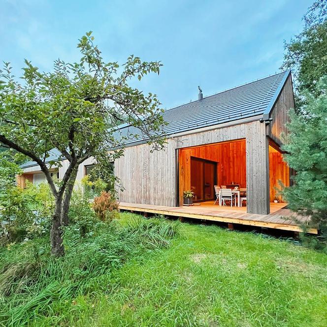 Fasadę można wykończyć drewnem. Wtedy panele zamiast tynkiem można pokryć membraną wiatroizolacyjną, obłożyć twardymi płytami z wełny drzewnej i zamocować elewację wentylowaną z desek