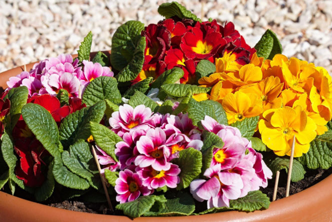 Prymulki atrakcyjnie prezentują się posadzone w jednej większej donicy