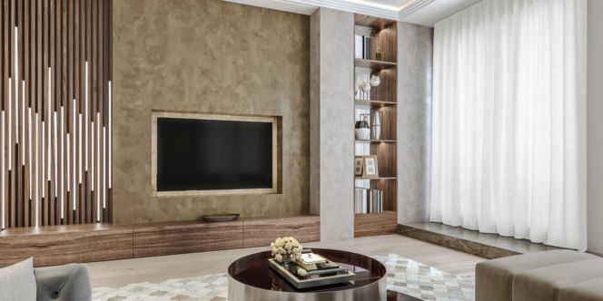 Wnętrze z jedną ścianą wykończoną stiukiem weneckim wygląda atrakcyjnie