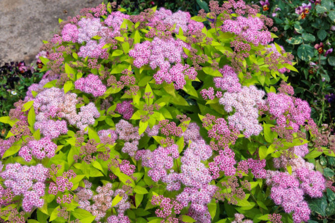 Wczesną wiosną liście wielu odmian tawuły japońskiej mają kolor żółty lub pomarańczowy