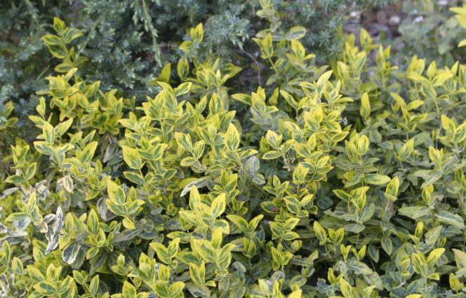 Liście trzmieliny Fortune'a mogą mieć różne wybarwienie – zielone, zielono-żółte, zielono-białe, a jesienią potrafią ładnie częściowo przebarwiać się na czerwono