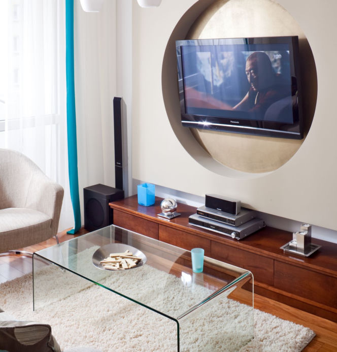 Koło wycięte wścianie z płyty gipsowo-kartonowej stało się ramą dla telewizora. Taka aranżacja ma swój praktyczny wymiar. Pod dobudowaną częścią ściany są ukryte kable do telewizora i sprzętu grającego