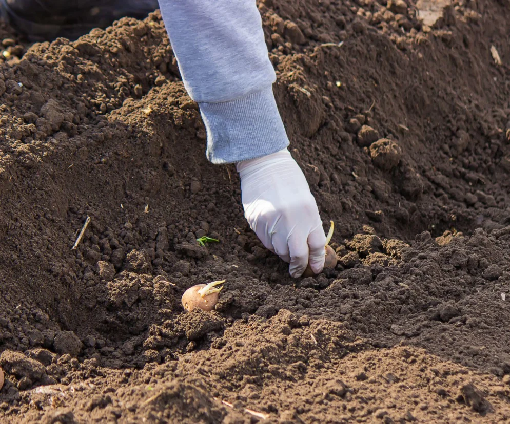 - Przykryj sadzeniak ziemią, delikatnie ją ugniatając.