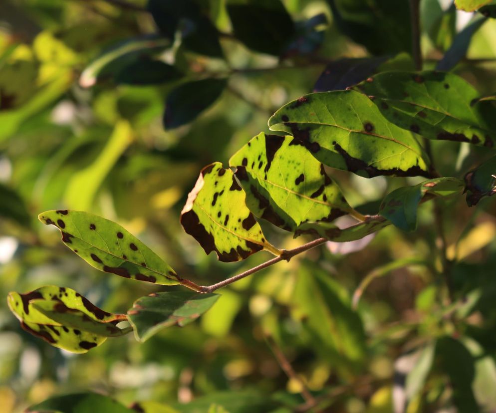 Ligustry zostały zaatakowane przez grzyb wywołujący plamistość zgorzelową (antraknoza). Choroba ta występuje najczęściej na liściach i ogonkach liściowych (w zaawansowanym stadium rozwoju może wystąpić na pędach) drzew i krzewów należących do wielu gatunków. Należy do chorób bardzo rozpowszechnionych, w Polsce chorobę tą stwierdzono m.in. na platanach, lipach, bukach, jesionach, klonach, ligustrach, magnoliach. Objawy chorobowe są zmienne i uzależnione od rośliny-gospodarza, wieku roślin oraz od warunków meteorologicznych. Cecha charakterystyczną tej choroby jest pojawianie się wiosną na liściach lekko zapadniętych i najczęściej nieregularnych, zlewających się plam (mogą być eliptyczne), których barwa uzależniona jest od gatunku rośliny-gospodarza. Początkowo plamy mogą mieć barwę brudnozieloną lub biało-popielatą (np. w przypadku ligustru) i mogą być otoczone ciemniejszymi obwódkami. Na pędach niektórych roślin występują również brunatne przebarwienia lub zrakowacenia (np. w przypadku ligustru). Na powierzchni chorych tkanek mogą pojawiać się oznaki etiologiczne (np. warstwiaki) grzyba – sprawcy tej choroby. Początkowo w łanie roślin pojawiają się gdzieniegdzie pojedyncze, więdnące pędy. Na ich powierzchni — w różnej odległości od podłoża — widać wydłużone, szaro-brązowe, a później brunatne, lekko zagłębione plamy rozszerzające się na obwodzie. Gdy obejmą one znaczną część lub cały obwód łodygi, dochodzi - ponad miejscem porażenia - do zmiany barwy liści na jasnozieloną, a następnie żółtą lub żółtobrązową. Na powierzchni nekrozy, zwłaszcza przy dużym zagęszczeniu krzewu (co przyczynia się do zwiększenia wilgotności względnej powietrza w bezpośrednim otoczeniu rośliny), widać początkowo różowawe, a następnie ciemne skupienia zarodników grzyba. Często pęd wyłamuje się w miejscach nekrotycznych plam. Zdarza się niejednokrotnie, że patogen poraża wyrastające, nowe pędy tuż nad powierzchnią podłoża. Grzyb bardzo szybko opanowuje takie młode tkanki i rozrasta się na obwodzie łodygi, niekiedy na długości kilkunastu centymetrów. Porażony organ brązowieje i wyraźnie przewęża się na granicy zdrowej i chorej tkanki. Liście ligustru i magnolii poraża grzyb Glomerella cingulata (Colletotrichum gloeosporioides Penz.). Rozprzestrzenienie choroby uzależnione jest od temperatury i wilgotności powietrza. Rozwojowi grzyba sprzyja temperatura przy optimum około 25°C. Bagatelizowanie konieczności ochrony lekko zainfekowanych roślin albo jedynie przeprowadzanie mechanicznych zabiegów polegających na usuwaniu chorych pędów czy całych krzewów prowadzi z każdym rokiem do coraz większych strat w materiale roślinnym. Metoda chemiczna polega na zastosowaniu środka Score 250 EC w stężeniu 0,05% po stwierdzeniu pierwszych objawów chorobowych. Zabieg należy powtórzyć w sezonie 2-3 razy co 7-10 dni zużywając 5-10 litrów cieczy roboczej na każde 100 m kw.