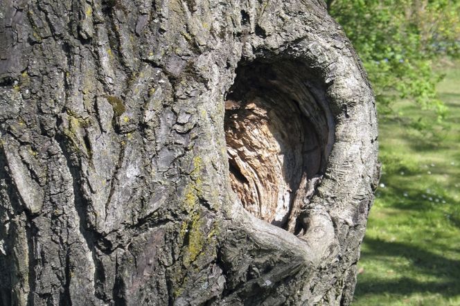 Taka rana, która stopniowo przekształca się w ubytek wgłębny (dziuplę) to spory problem. Specjaliści (chirurdzy drzew) odeszli od metod dawniej stosowanych i właściwie nie ma odpowiedzi, co robić z już istniejącym ubytkiem (świeże rany zaleca się smarować maścią ogrodniczą, albo farbą emulsyjną z dodatkiem Funabenu, albo samą farbą emulsyjną -oczywiście, im mniejsza rana tym lepiej). Kiedyś w przypadku istniejących ubytków wgłębnych zalecało się oczyszczenie ścianek do czystego drewna, nadanie ranie możliwie podłużnego kształtu (w kierunku przepływu soków, czyli wzdłuż pnia lub konaru), w najwyższym i najniższym punkcie rany uformowanie ostrych szczytów i zamalowanie odpowiednim preparatem, ale stwierdzono, że drzewo samo wytwarza barierę ochronną broniącą przed infekcjami, a takie działanie ją niszczy. Najlepiej więc bardzo delikatnie usunąć - jeśli jest - zmurszałą tkankę, ale nie skrobać drewna "do białego". Drzewo powinno wzdłuż krawędzi rany wytworzyć tkankę gojącą (taki wałek) i stopniowo pokrywać nią ranę. Sprzyjać temu będzie zasilenie drzewa kompostem rozłożonym w obrębie rzutu korony, bo im zdrowsze drzewo tym szybciej upora się z raną. Zdania na temat pokrywania ran też są różne - rana powinna być przewietrzana, a nałożona warstwa hamuje dostęp powietrza. Jednak z kolei obserwuję w wielu przypadkach, że rozkład drewna pokrytego farbą emulsyjną zostaje zahamowany. Uważam, że po oczyszczeniu ubytku (ale nie inwazyjnym) warto jego wnętrze posmarować farbą emulsyjną (ciemna, żeby nie rzucała się w oczy), lub tzw. sztuczną korą albo maścią ogrodniczą. Co do osłonięcia ubytku - wszystko zależy od jego kształtu. Jeśli otwarty jest od góry można spróbować skonstruować rodzaj daszku z cienkiego tworzywa, po którym będzie spływała woda. Jednak przybijanie do pnia czy konaru nie jest wskazane (ewentualnie bardzo małymi nierdzewnymi gwoździami). Trzeba też pamiętać, że taka osłona nie może przylegać szczelnie, bo musi być zapewniona cyrkulacje powietrza.