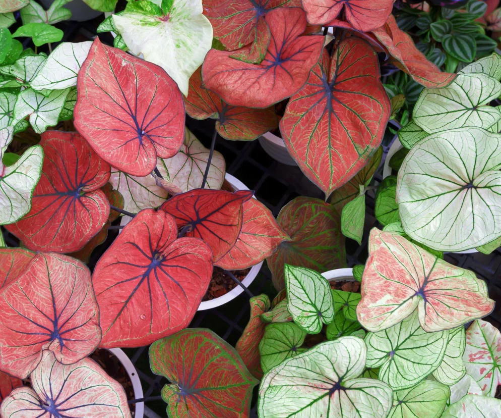 - kaladium 'Florida Sweetheart' o czerwono-różowych liściach z zielonym obrzeżem,