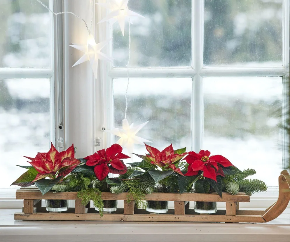 Umieść sześć miniaturowych gwiazd betlejemskich w trzech różnych kolorach w pudełku prezentowym i zawiąż satynową kokardę wokół. Aby uzyskać luksusową wersję, umieść poinsecje w ozdobnych doniczkach.
