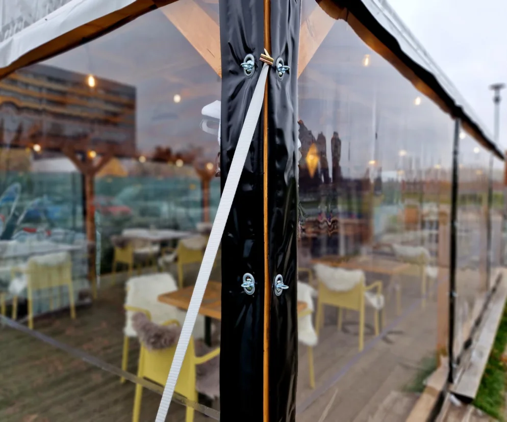 Najpopularniejsze są plandeki z PCV - przezroczyste lub półprzezroczyste, o grubości od 0,3 mm do 0,8 mm, idealne do zabudowy całorocznej; zapewniają pełną wodoodporność i odporność na temperatury poniżej -20°C, z opcjami rolowanymi dla łatwego wietrzenia.