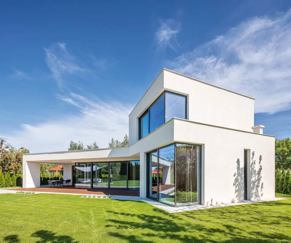 - Co wyróżnia ten dom: czysta forma i duże narożne przeszklenia