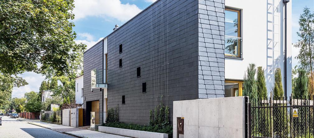 Stara warszawska dzielnica, domy z początku wieku, bliźniaki z lat 50., zieleń, tu i ówdzie drzewa owocowe - wszystko to sprawia, że mimowolnie przenosimy się w przeszłość. Dopóki nie zaskoczy nas widok nowoczesnego ciemnego budynku z płaskim dachem, który przypomina nam o teraźniejszości. Nowoczesna bryła z wejściem wprost z ulicy diametralnie różni się od sąsiednich domów, a jednak nie burzy zastanego porządku i kompozycji ulicy. Wpisuje się w miejsce. Może to za sprawą oszczędnej formy architektonicznej, a może elewacji z łupku?