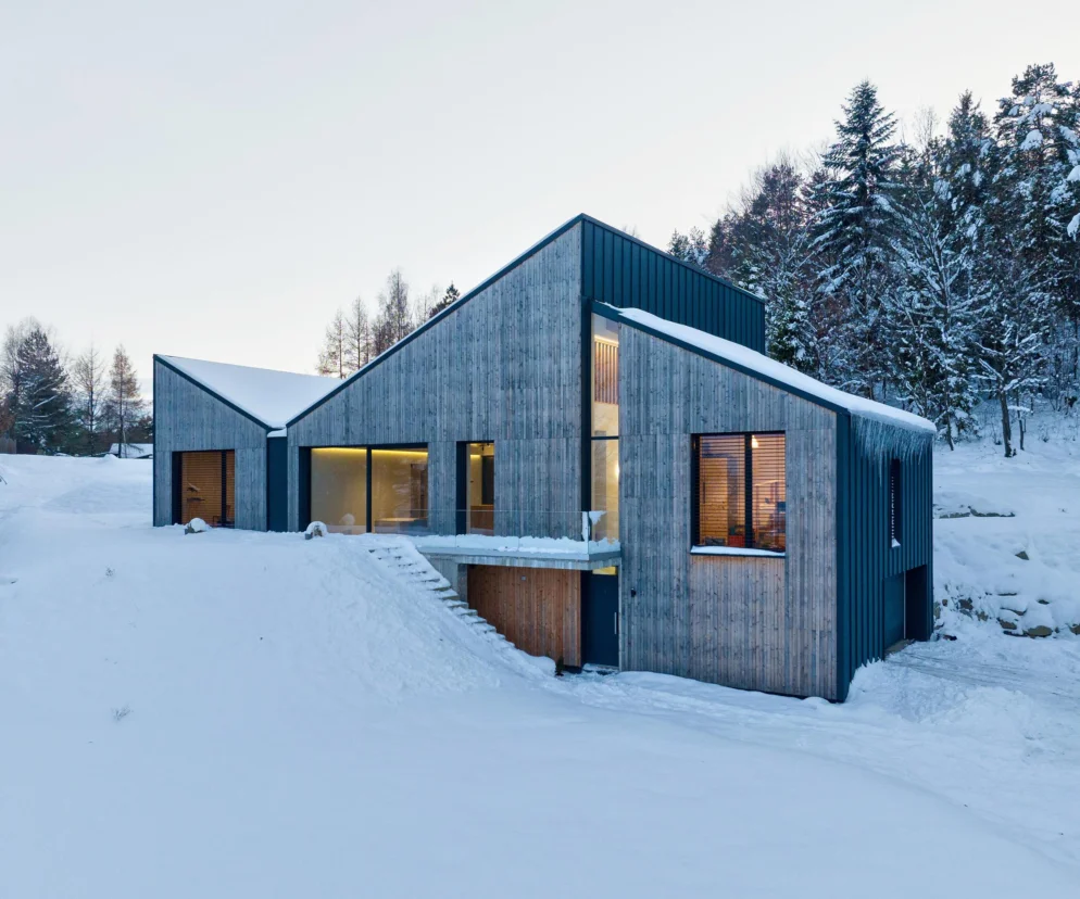 Dom usytuowano na działce w centralnym jej punkcie w taki sposób, aby wykorzystać jej uwarunkowania oraz uchwycić najlepszy widok na panoramę gór. Dzięki temu pomieszczenia otwierają się na dwie strony – albo na wspaniały widok gór albo na zieloną ścianę lasu.