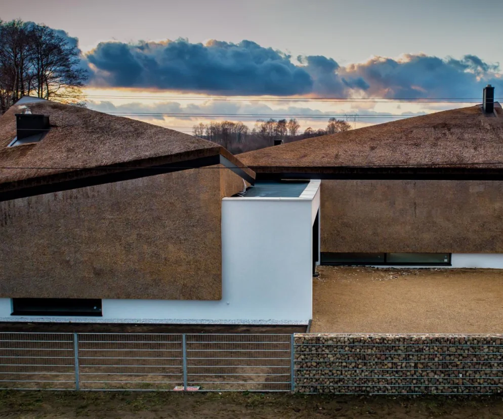 Wprawdzie pracownie architektoniczne proponują różne wersje trzcinowych dachów, także bardzo nowoczesne czy schodzące ku ziemi, ale tym razem zestawienie niespotykanej – żeglarskiej – formy dachu z materiałem wykorzystanym w skali makro dało zaskakujący efekt.