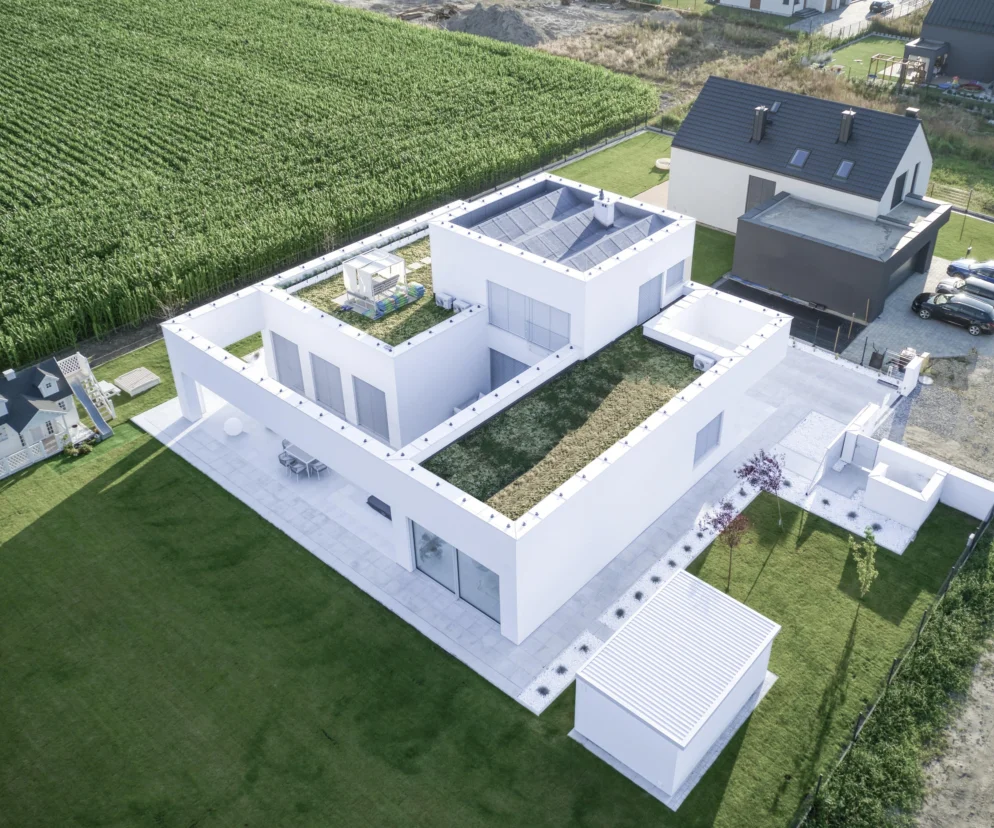 Białe elewacje, białe wnętrza, zielone dachy