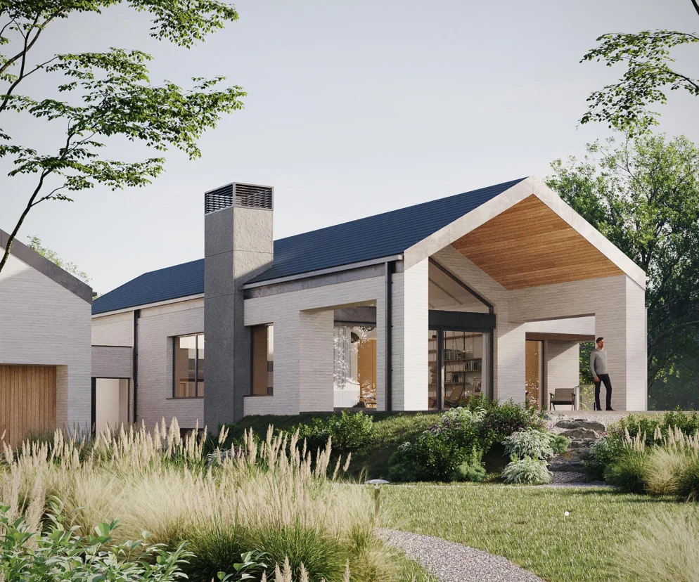 Inwestorzy pragnęli stworzyć dom nowoczesny, a zarazem przytulny i wpisany w naturalny krajobraz – z nutą sielskości, która buduje atmosferę codzienności. Tak powstała koncepcja budynku, którego sercem – zarówno fizycznym, jak i symbolicznym – stał się komin. Jego zdecydowana forma wznosi się ponad linię dachu, wyznaczając centralny punkt życia rodzinnego. Wykończony surową betonową okładziną, łączy współczesny charakter architektury z archetypicznym obrazem domowego ogniska. To właśnie wokół niego skupia się codzienność – bez telewizora, za to z rozmowami, muzyką i wspólnym byciem razem.