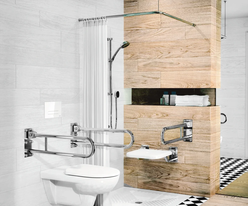 Wygodniejsza od wanny będzie z pewnością kabina prysznicowa, oczywiście typu walk-in, czyli bez brodzika. Ważne, by prowadzące do niej drzwi były odpowiednio szerokie. Ciekawie prezentują się też kabiny wydzielone przez trzy lub dwie ścianki niemające zamknięcia. Pod natryskiem powinno znajdować się stabilnie zamocowane, odporne na wodę siedzisko – ulokowane na tej samej wysokości co siedzenie wózka. Rzecz jasna, z towarzyszącą mu poręczą lub dwiema.