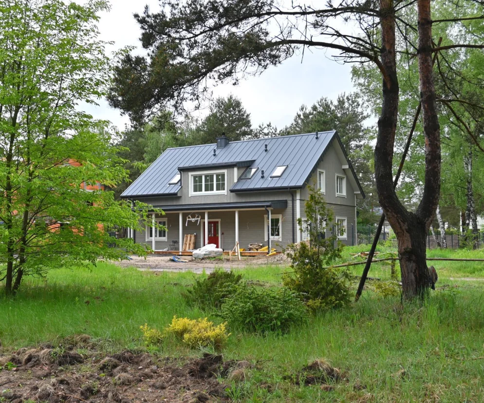 Dom państwa Marii i Marcina ma powierzchnię 240 m2, czyli nie jest mały. Musi pomieścić ośmioosobową rodzinę. Jest tradycyjny, z poddaszem użytkowym, dwoma werandami – jedna od frontu, druga od ogrodu i szerokimi prostokątnymi jaskółkami w dwuspadowym dachu. Jaskółki są na tyle duże, że w ich szerokości mieszczą się całe dwa pokoje bez skosów na poddaszu. Marcin i Maria wybrali elewację drewnianą ze szczotkowanych pokrytych farbą w szarym kolorze desek. Takie rozwiązanie pasuje do tradycyjnej bryły, leśnego tła i lokalnej tradycji budowy domów z drewna, których najpiękniejszymi reprezentantami są słynne „świdermajery”.