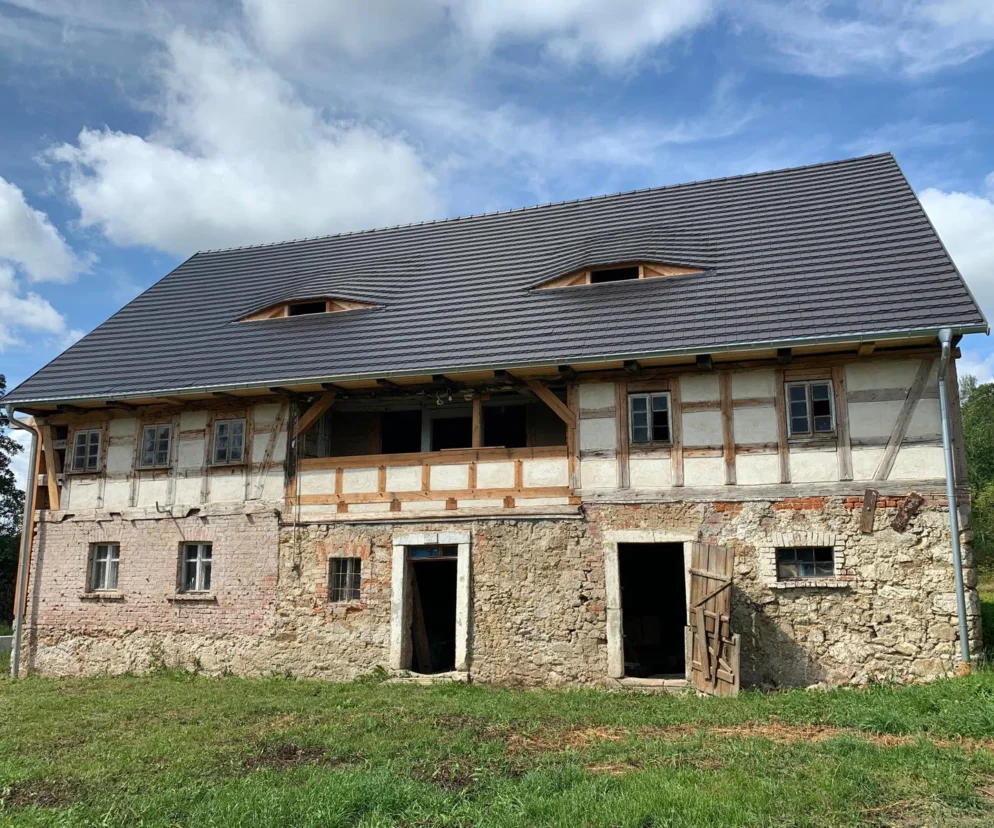 Pokrycie dachów wszystkich trzech budynków gospodarstwa wykonane jest ze starej angobowanej ryflowanej karpiówki. Panu Piotrowi bardzo zależało, żeby zachować dachy w oryginalnym stylu, ale remont wypadł jeszcze w okresie pandemii, więc takiego typu dachówki nie były dostępne na terenie Polski, a nawet w hurtowniach w Saksonii i Brandenburgii. Nie było ich nigdzie w hurtowniach z powodu wstrzymania produkcji przez pandemię covid. Udało się je w końcu sprowadzić przez firmę Wienerberger do Wrocławia, więc można było zaplanować wymianę. Grafitowa angoba z ryflami na powierzchni każdej dachówki mieniąca się w słońcu i sposób ułożenia w koronkę nadaje połaciom wyjątkowego charakteru. Takie samo pokrycie otrzymał też ceglany dom gospodarczy. Na wymianę oczekuje stodoła.