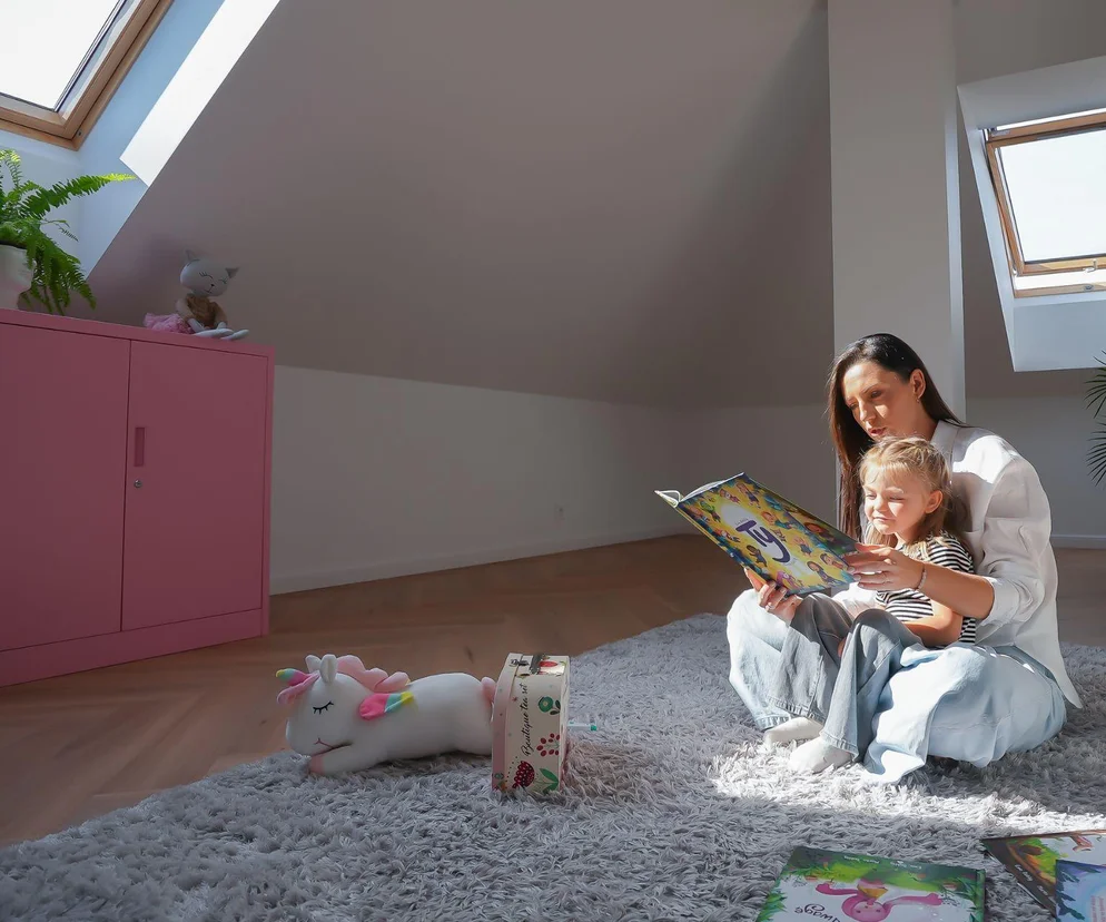 Poddasze ma 80 metrów powierzchni użytkowej i wysoką ściankę kolankową. Jarosław i Karolina wybrali drewniane okna dachowe VELUX GLL w rozmiarze 94x140 z klamką w dolnej części skrzydła, dzięki czemu mogą je wygodnie otwierać i zamykać bez konieczności schylania się. W sumie na poddaszu zostało zamontowanych dziewięć okien dachowych, w tym cztery w zestawie kombi, czyli dwa okna obok siebie, co pozwoliło na jeszcze lepsze doświetlenie przestrzeni. Na oknach zostały zamontowane elektryczne rolety zewnętrzne VELUX SML, które zapewnią komfort termiczny o każdej porze roku. Latem będą chroniły przed nagrzewaniem wnętrza, a zimą sprawdzą jako dodatkowa bariera przed utratą ciepła. Dodatkowo rolety ograniczą hałas z zewnątrz i zapewnią całkowite zaciemnienie, co będzie szczególnie przydatne w pokojach dzieci.