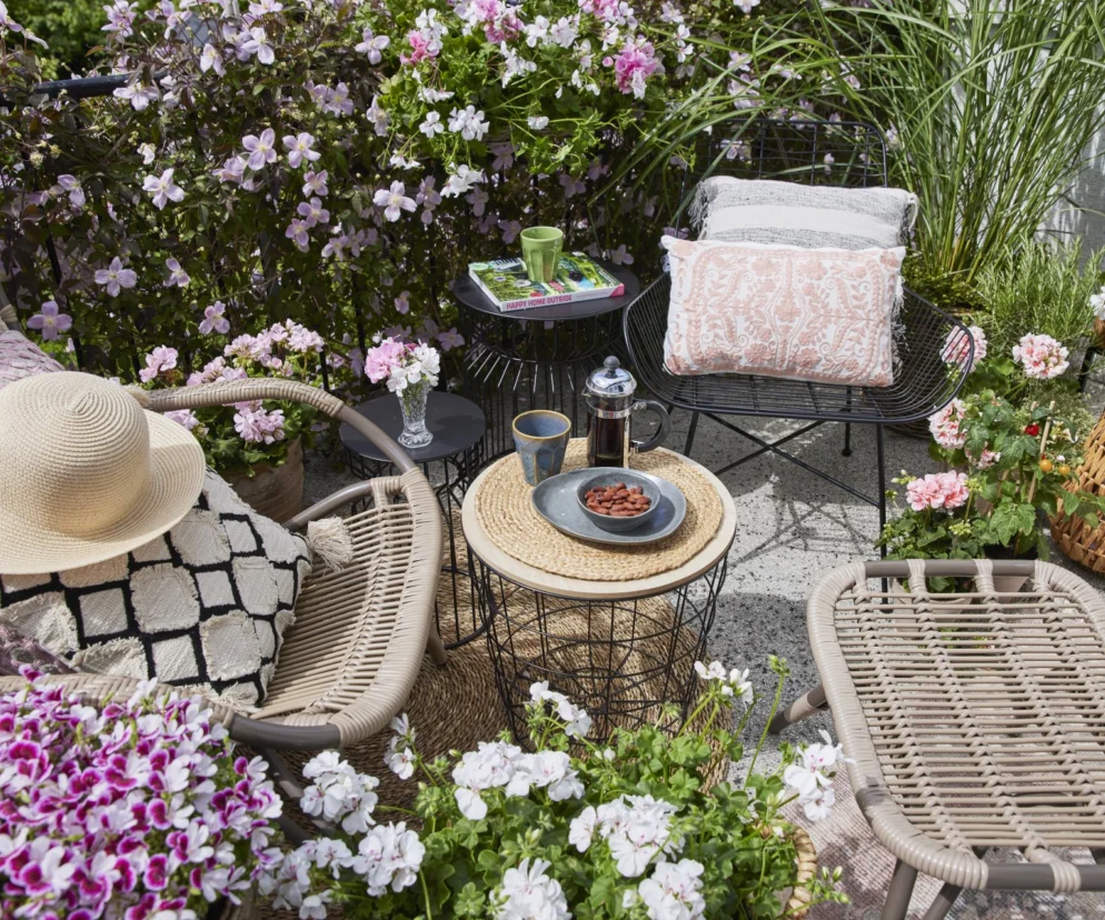 Jeśli kochasz rośliny, twój salon pod chmurką może w nich wprost tonąć. Nie masz ręki do roślin? Wybierz gatunki wytrzymałe, nie wymagające wielu zabiegów pielęgnacyjnych, choćby pelargonie, begonie, surfinie czy kalibrachoa. Jeśli miejsca jest więcej, warto zasadzić rośliny wieloletnie, a także zimozielone (iglaki, najlepiej wolno rosnące oraz bluszcz pospolity), by było pięknie także po sezonie.