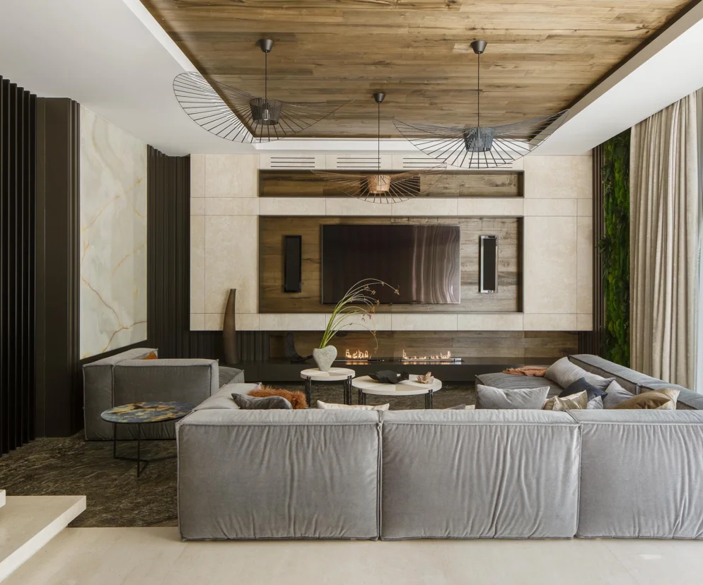 Kolory są stonowane – dominują różne odcienie szarości i beżu, które działają kojąco i stanowią neutralne tło wyeksponowania dekoracji i sztuki, jak na przykład kobiecy portret w salonie, namalowany przez portugalskiego artystę na odzyskanych deskach, czy autorska mozaika w łazience gościnnej. W strefie wypoczynkowej stoją wygodne, niskie meble o minimalistycznych formach, w neutralnych tkaninach. Kanapy ustawiono tak, aby widok na ogród i światło dzienne były jednym z kluczowych elementów aranżacji. Salon to nowoczesna, elegancka, przyjazna i funkcjonalna przestrzeń, w której można zarówno przyjąć gości, jak i spędzić spokojne popołudnie z rodziną.