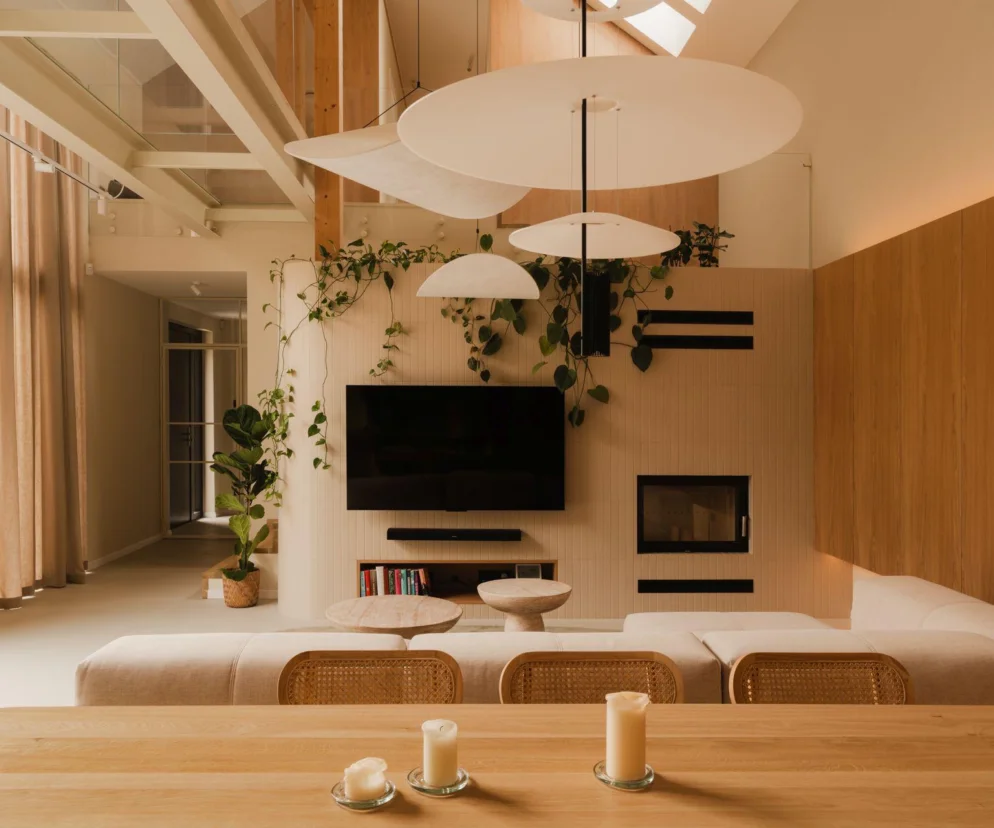 Wnętrza domu utrzymane są w naturalnych odcieniach beżu i drewna, co już od progu buduje poczucie spokoju. Drewno, z jego wyraźnym rysunkiem słojów, oraz miękkie tkaniny w odcieniach écru tworzą przestrzeń przyjazną dla zmysłów.