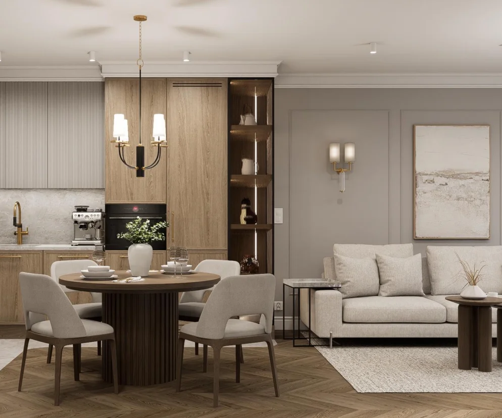 Drewniana podłoga ułożona w jodełkę oraz wykończenie mebli fornirem nadają przestrzeni przytulności, którą potęguje subtelny kaszmirowy odcień szarości i biel. Te naturalne kolory tworzą spokojną, ale elegancką bazę, która współgra z resztą aranżacji.