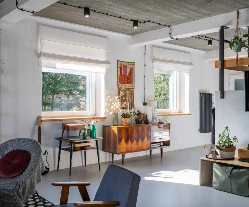Styl loftowy Ola ceni za surowość, autentyczność i możliwość kreacji. – To surowa baza, którą można bardzo różnie zaaranżować, np. właśnie perełkami PRL-owskiego dizajnu – wyjaśnia. – Pozostawiliśmy więc na parterze sufit w postaci betonowego, stropu, wyeksponowaliśmy instalację elektryczną, by było wręcz postfabrycznie oraz wybraliśmy posadzę z żywicy poliuretanowej, często znajdującej zastosowanie w halach produkcyjnych czy budynkach użyteczności publicznej. Z niej są także schody na piętro. Wybór był to doskonały!
