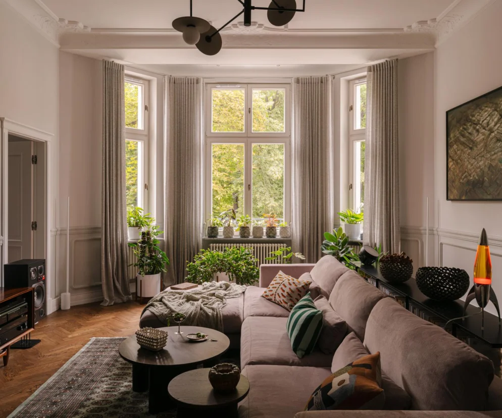 Centralnym punktem salonu jest duża, wygodna sofa, zestawiona z okrągłymi stolikami i meblami inspirowanymi stylem mid-century modern. Sztukaterie, które stanowią elegancki element łączący klasyczną strukturę budynku z nowoczesnym wyposażeniem.