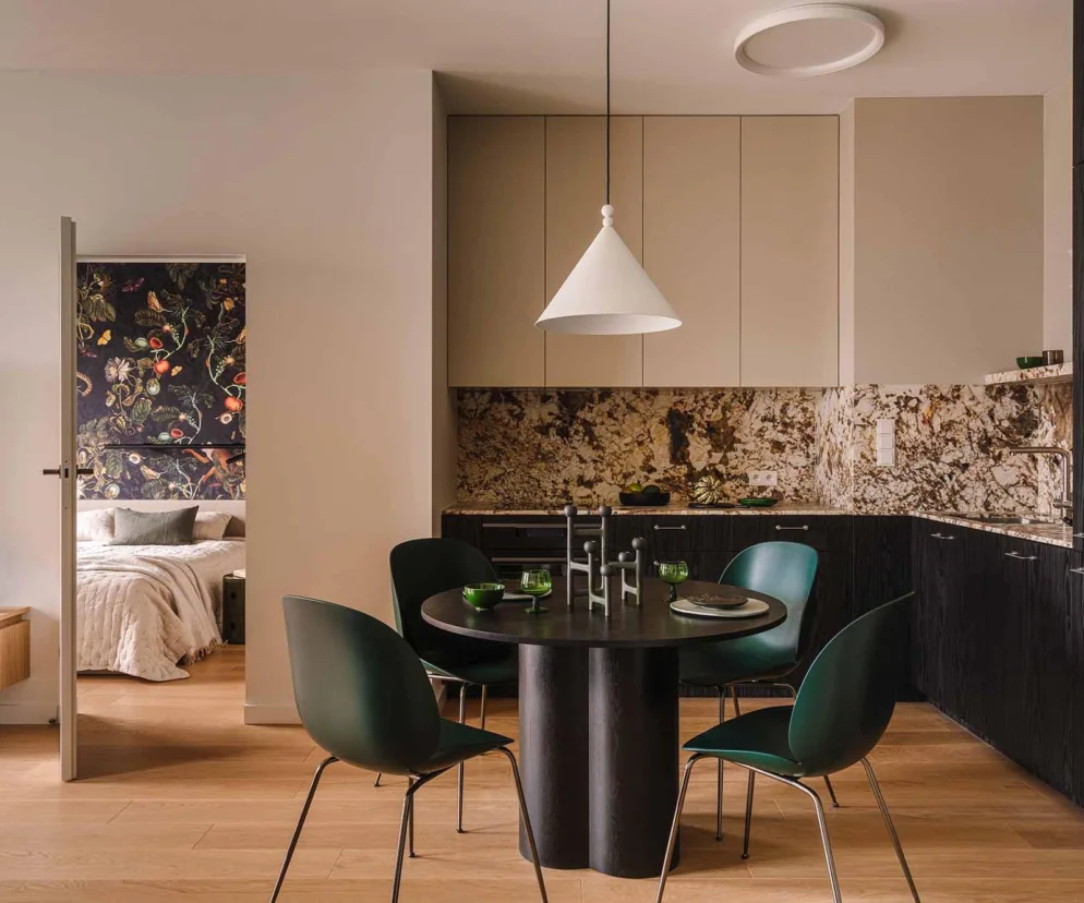 Kuchnia i jadalnia stanowią wyraźny kontrapunkt dla jasnej strefy wypoczynkowej. Ciemna kolorystyka, czarne akcenty i fornir nadają im bardziej graficzny charakter. Zabudowa kuchni płynnie łączy się z holem, a górne szafki – wykończone w kolorze ścian – nie dominują przestrzeni. Blaty i okładziny wykonano z naturalnego kwarcu, który łączy estetykę z funkcjonalnością.